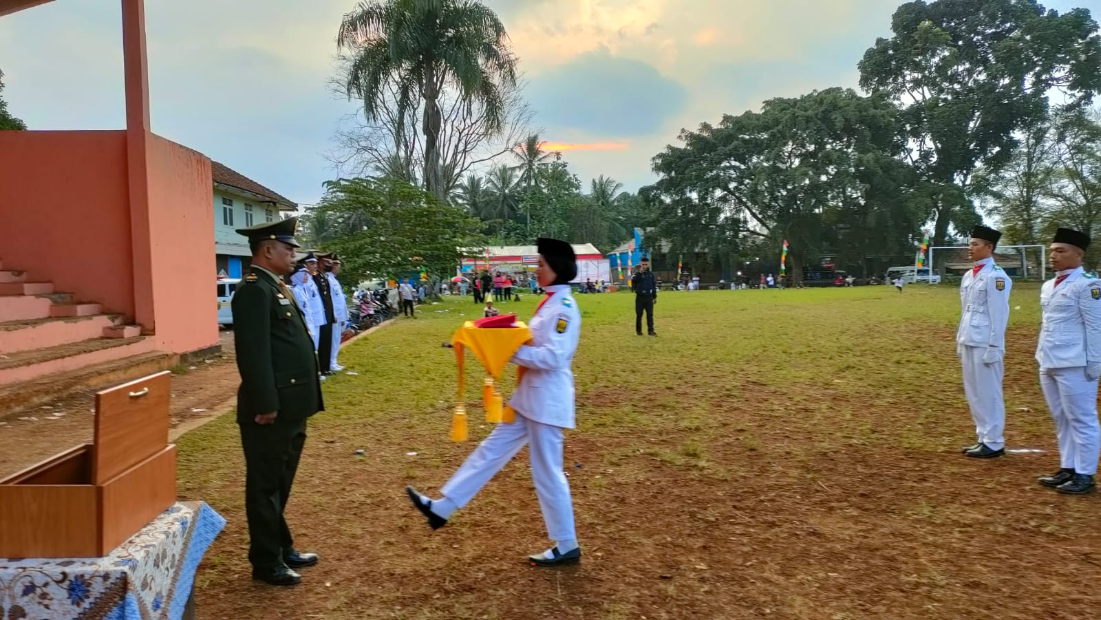 sutvartikel.com || Sukabumi – Kapolsek Gunungguruh Iptu Didin Waslidin melaksanakan Upacara Penurunan Bendera Merah Putih, Dalam Rangka memperingati HUT RI ke-77 Tahun, bertempat di Lapangan sepakbola Mangkalaya Gunungguruh Kabupaten Sukabumi, Rabu (17/8/22)